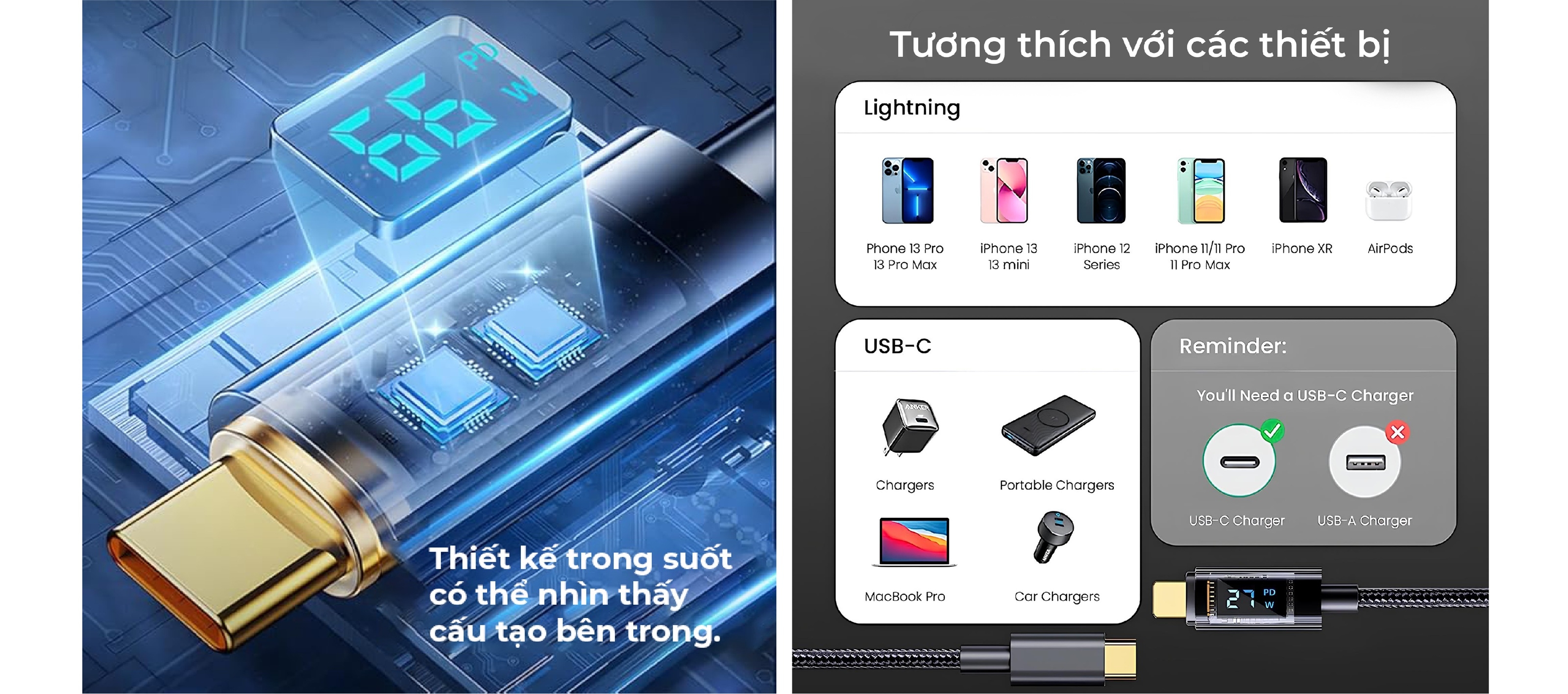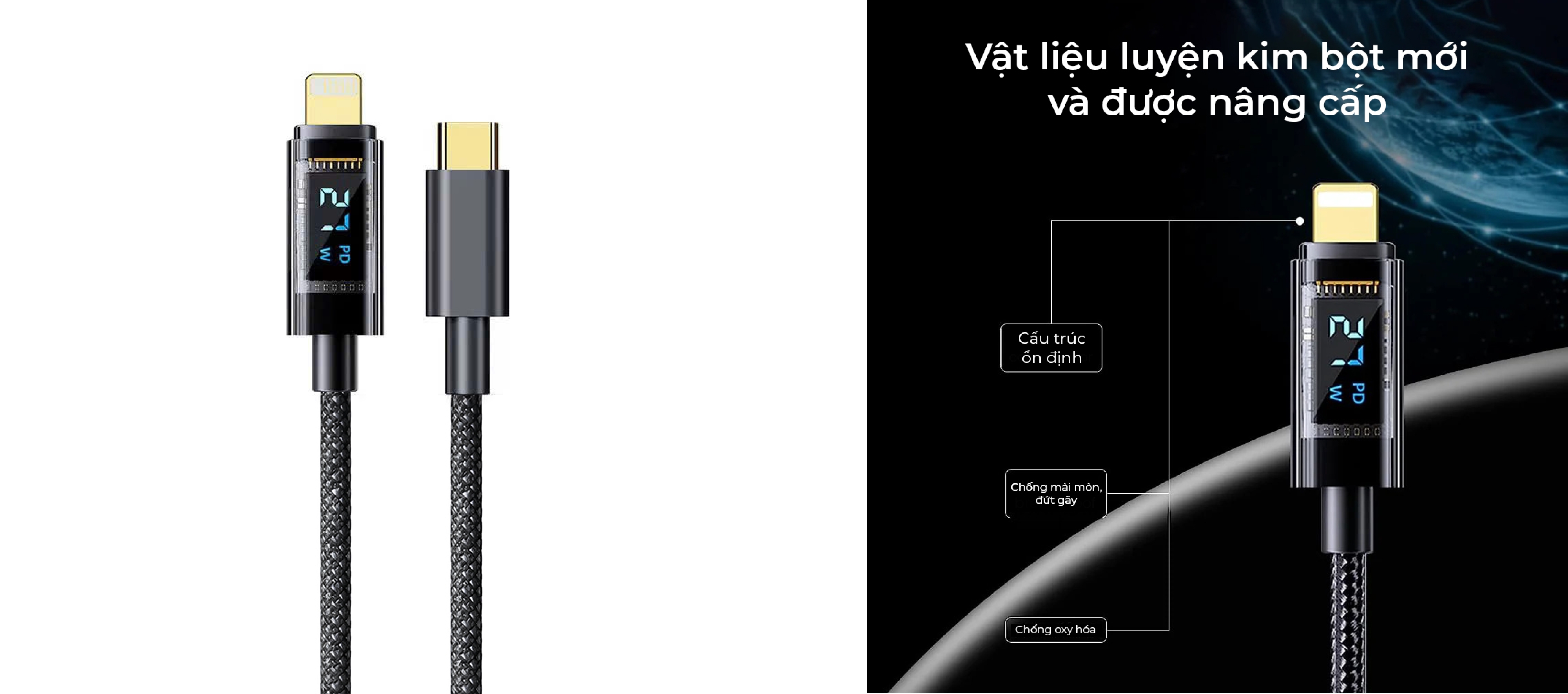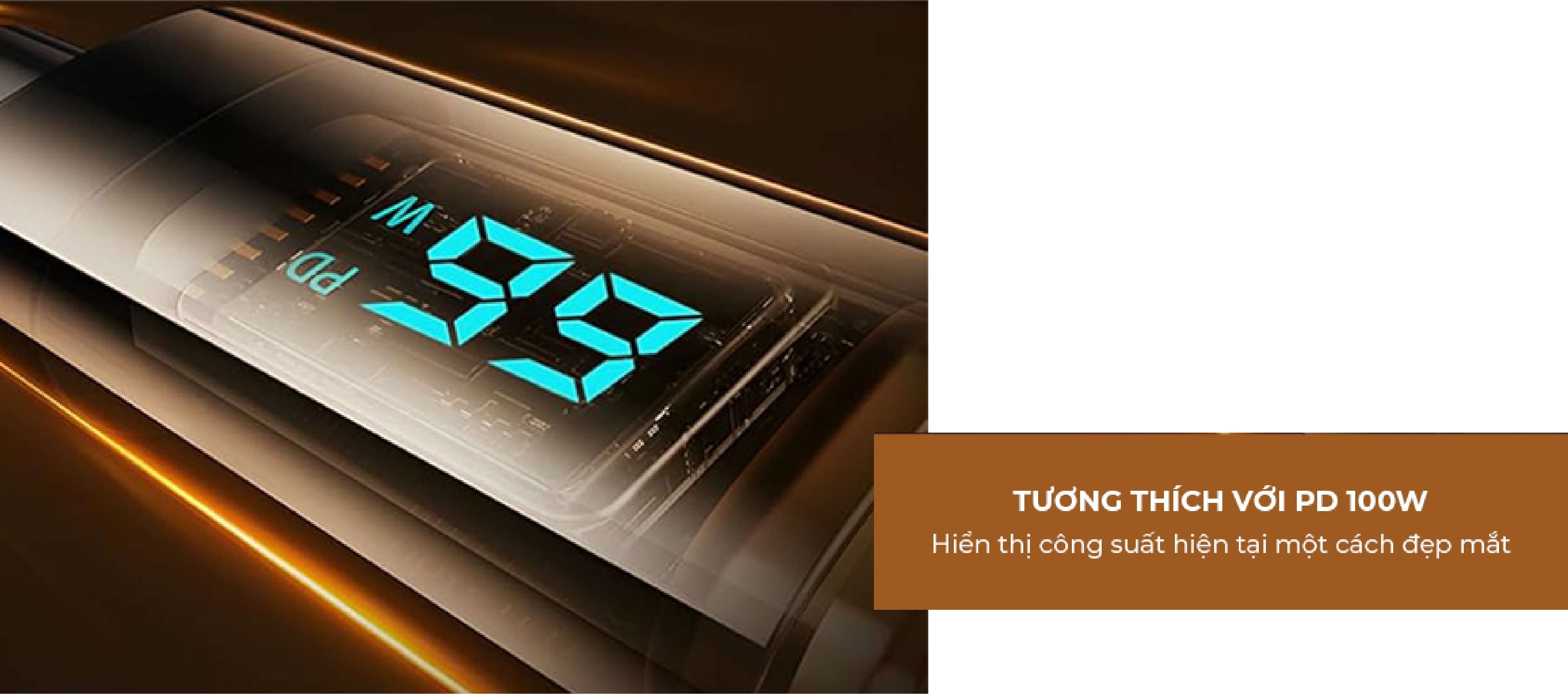 Thiết kế lộ mạch ấn tượng: Đầu cáp được làm trong suốt, lộ bảng mạch tích hợp màn hình LED hiển thị công suất sạc thực tế cực chất và hiện đại.
