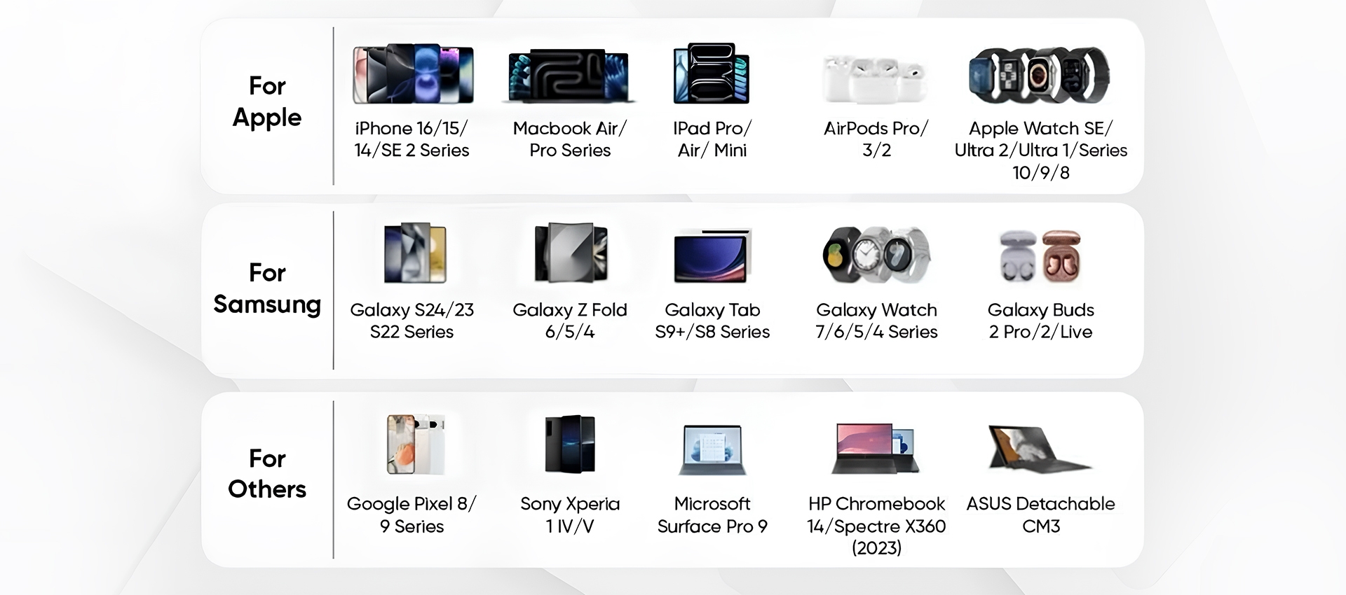 - Tương thích chuẩn sạc phổ biến – PD 3.0, QC 3.0, PPS, hỗ trợ tốt cho iPhone, Samsung, Xiaomi, tai nghe không dây, máy chơi game cầm tay…