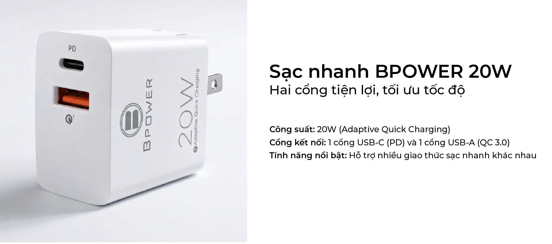 - Công suất sạc nhanh 20W – hỗ trợ sạc nhanh hiệu quả cho các thiết bị phổ biến.