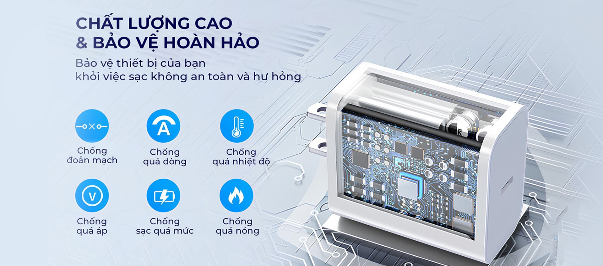 - Sử dụng công nghệ GaN Mosfet thế hệ mới – giảm nhiệt lượng, tăng hiệu suất sạc, kéo dài độ bền sản phẩm.